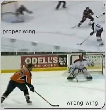 Both shooters in the photos to the right are in roughly the same spot, but the shooter in the top photo is on his proper wing - he shoots left and he's on the left wing, and the shooter in the bottom photo is on his off wing - he shoots right and he's on the left wing. On the other side of the ice, it would be the opposite; a right shooter would be on his proper wing, and a left shooter would be on his wrong wing.