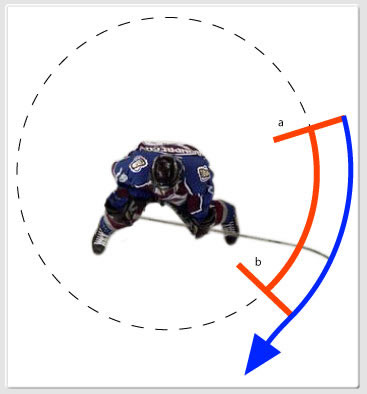 Similarly in hockey. A player gets the most power into his wrist shot when he uses a full rotation,and this rotation will 'pull' the puck. With our shooter to the left, he starts his wind-up at 'a', and by 'b', he's reached maximum rotational power and should release the puck. Releasing it at that point will 'pull' the puck to his right. Of course, on the ice 'a' to 'b' will be a straight line, but body rotation and a release point forward will pull the puck. Check the clip above.