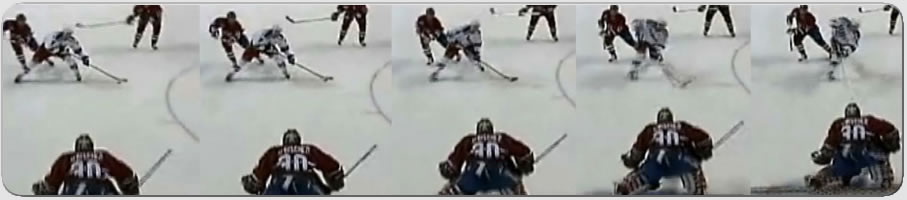 Again, the right leg drops and the shot goes high. Good shooters really can put the puck anywhere, but if you want to play the averages, it's always a good idea to stay on your feet, and keep your hands up. |