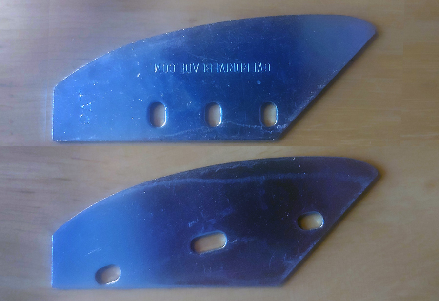 This page will show the Overdrive install for all skates without a cowling, including all the newest Bauer, CCM, and True skates. Below are the two Overdrive blades: old one on top; new one on the bottom. The only difference between the two is the holes. The blades are made from the same steel and punched from the same blank, and they use the same hardware. The lettering was removed to make it easier to get the new holes in. |