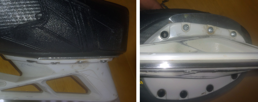 Below are three shots from a customer (I have to go back in my email to get his name) who installed on his CCM 9380 Super Tacks, a really nice skate. His shots are way better than mine, so they're worth a closer look. I'm going to start including washers, because you can see how the screws sank into the plastic. |