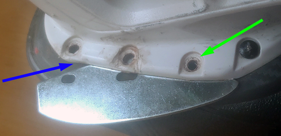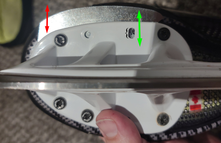 My initial concern with this install was whether lifting the blade holder on one side only would twist or warp the main blade. It doesn't. Most skate sharpeners have a tool to measure such a thing, and I was happy to discover that lifting the blade holder like this didn't affect it at all. Every time I measured this, the blade sat square its full length, and it still does. This makes sense because Overdrive is 1/16" thick, and when it slides into this position, the boot absorbs some of that height by indenting very slightly. The blade holder absorbs the rest, and you see it doing just that with the green arrow above. Any residual effect is absorbed by the rest of the blade holder. And the chance of a plastic blade holder twisting or warping a hardened steel blade is zero. The blade holder is strong and durable, but it's still plastic, so it has a certain softness (blue arrows, that's from removing the rivets) and will always give way to the hardened steel of the main blade. There is no change in the feel of the skate, no effect on sharpening or anything else I can think of. None. I wouldn't have bothered with this blade if there was.