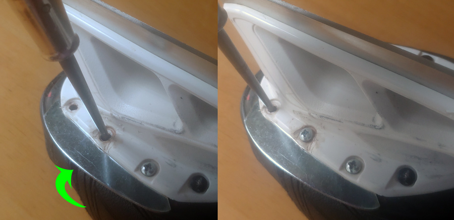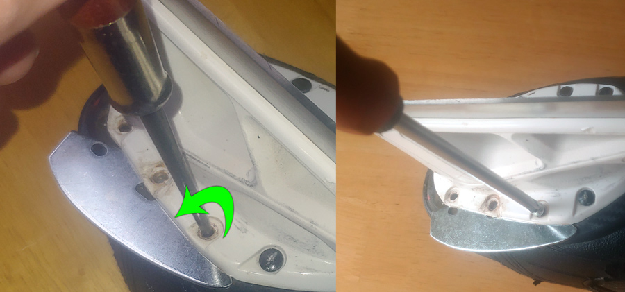 Next, you'll swing the blade so that the second hole lines up (below, green arrow). Then you'll insert a long screw and follow the same procedure: thread the T-nut, tighten it down into the sole of the skate, remove the long screw, replace it with a short screw, but keep this screw loose. (steps 1-5 above) With two screws done, the top hole should be almost lined up, but if not, insert an awl, or screwdriver, and wiggle it a bit to line it up (below right). Then, you'll follow steps 1-5 above to finish the top hole. If you have a hard time reaching inside the boot with the T-nut, if your hands are big or there's no room inside, you can just leave the top hole. The blade will hold with two screws, and next time you get your skates sharpened, have your guy pop a rivet in there, and he better not charge for it! With the three short screws in, you can now tighten them all down, but be careful not to torque them too much because you don't want to strip the screw-head. Again, there's no need for them to be super tight. After a week or two, you can check them in case the sole inside the skate has compressed with the pressure, thereby leaving the screws a bit loose. Don't worry if you forget. The blades won't fall off. In testing these blades, I changed them dozens of times over the last year and never once remembered to do that. Also, don't worry about ruining the hardware or losing it. If you need more, let me know and I'll send it out, no charge. And if you change skates, I send replacement hardware for free. |