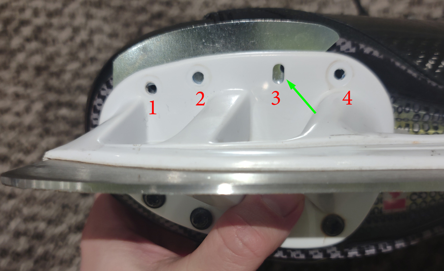 Below is the result on his left skate. He postioned the Overdrive hole at about the middle of the Graf hole and drilled to expand the blade holder hole. Then he drilled into the boot to create a new hole for Overdrive. You can see on the bottom side of the blade holder that the other hole #3 is not drilled. If Graf starts using this hole and Overdrive still does not line up properly, then you'll have to remove that screw before drilling to expand the hole. You do that by first unscrewing the screw until it's almost out, then hitting it with a hammer. That will pop the screw holder inside the boot. Repeat if necessary if it doesn't come out. If you don't want to damage the screw head, then use a nail. Then drill. When you attach the blade by that hole, you will likely have to use an Overdrive screw, as those Graf screws require some dexterity to install and they may spin in the bigger hole.