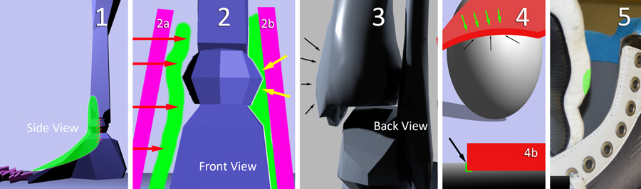 Goalies don't need a lot of sideways roll, and in #1 below (the same skate as above in #4), the green lines show how much sideways roll you'll use for most moves. If you need more, there's always some flex in the boot (red lines) or you could loosen the laces. Not enough sideways roll is never ever a problem, even with this very tall boot. The problem with this boot is that it won't give you any forward lean (#2), so goalie skates were lowered, resulting in very little ankle support (#3), but a lot of forward lean (#4). Below, we'll see why ankle support (or roll control) is so important. |
