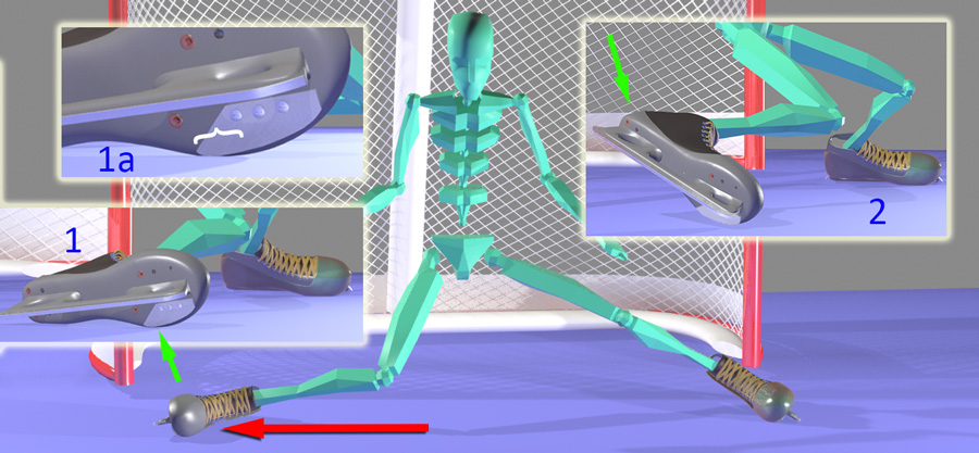 The first thing to note is that because the blade is curved, only a portion of it can scrape at any one time, and unless you're moving wrong, it will always be the bottom third of the blade (below 1a, white bracket). In the image below, the goalie's right leg is sliding right (red arrow), and if we take a look at that foot from another angle, we see that as it slides out, only the bottom portion of the blade comes close to the ice (below 1, green arrow). It's very unlikely that the top 2/3 of the blade will scrape the ice when the foot slides out because the heel would have to lift a lot (below, 2), involving an awkward twist of the foot (green arrow) that would also break the seal of the pad along the ice. |