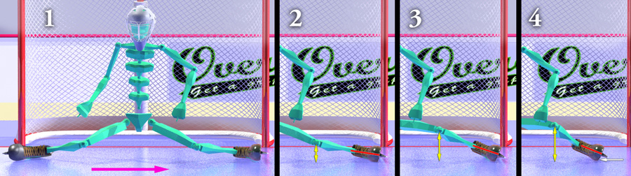 Above is a butterfly push to the right with Overdrive. The goalie in frame 1 is down and has lifted his left leg to push across with. In frames 2,3,4, he pushes across to a full extension. Without Overdrive, he'll run out of blade to push with before that, let's say in #3. When you put on Overdrive, your move will be programmed to stop pushing when your body is in position #3, so you'll have to practice the move to get it used to pushing farther and wider, to the position in frame 4. Again, this happens naturally when you practice the move. |