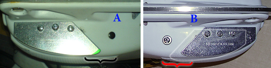 Below shows two RBK skates with Overdrive installed properly. A customer sent the photo on the left of a store install, and the skate on the right is mine. When the foot slides out properly, the part of the boot that contacts the ice is shown by the black and red curly brackets, and you can see that Overdrive only occupies half that space or less - note that the bottom portion of the blade is angled in (green shading). If Overdrive is installed incorrectly, either too far out, too far back, or both (faded Overdrive, B) then it will occupy more of that sliding space and increase your chances of scraping without improving grip. |