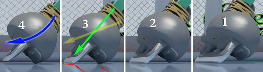 If your butterfly slide is slow and rough, if you're not using your ankles properly, and especially if you've installed the blade too far out, Overdrive can roll you back onto your main blade and stop the move. In fact, if you can't do a proper butterfly slide, then you're not ready for Overdrive. In the strip below, the goalie starts a butterfly slide, but his foot catches in #2 (green line) and the momentum throws him off balance so that by #4, he is close to keeling onto his right side. If you can't control your ankle as the foot slides out, then Overdrive can engage (below A) and roll you back onto your main blade (below B), then the main blade will stop the move. Again - the main blade will stop the move. On this move, you have to keep your ankle firm as the foot slides out so that if you do contact Overdrive, you will scrape through it as quickly as possible. |
